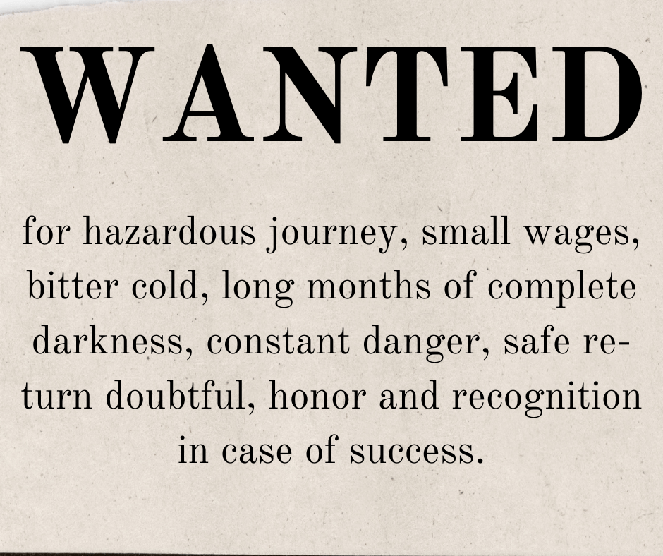 * It is said that explorer Sir Ernest Shackleton placed a similar wanted ad in the newspaper, looking for volunteers to join his expedition to Antarctica. A leaders wanted ad might look similar.